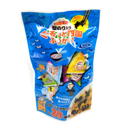 こちらの『ぐるっと四国ふりかけ』は、四国の観光名所など29種類の型のりが入ったふりかけです。
